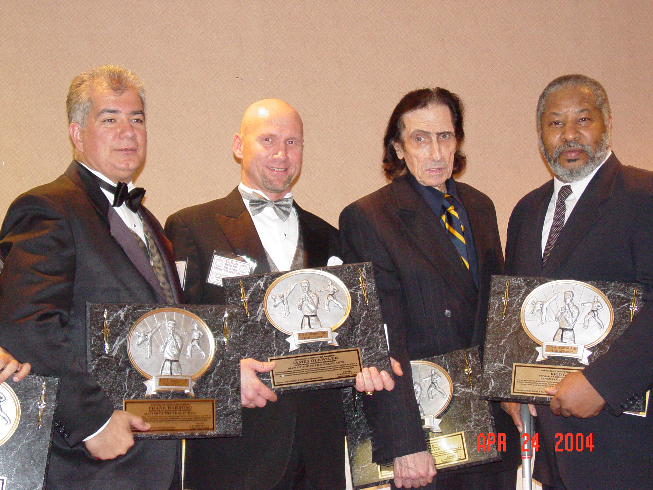 (center left) is Mr. O with (center right) World famous Grand Master: Aaron Banks receiving USA Martial Arts Hall of Fame Awards in 2004 NYC.