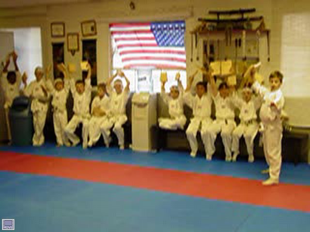 M.A.C.E. martial arts academy early days video photo, Mr Bradford Olivio seen on the far right (standing with a left knife hand pose and a broken board in his right hand. Is now an Assistant Instructor at Mace martial arts academy his rank is 1st degree Black belt. To become a black belt you cant quit. Winners never quit and Quitters never win